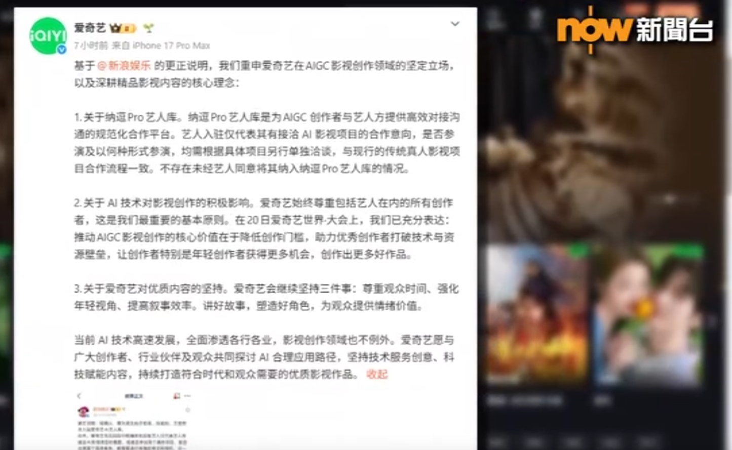 【Now新聞台】內地串流影視平台愛奇藝宣布推出AI藝人庫,協助生成相關藝人的作品,並宣稱有過百名藝人入駐,引發爭議。多名藝人紛紛否認合作,愛奇藝澄清不存在未經藝人同意將其納入AI藝人庫。
