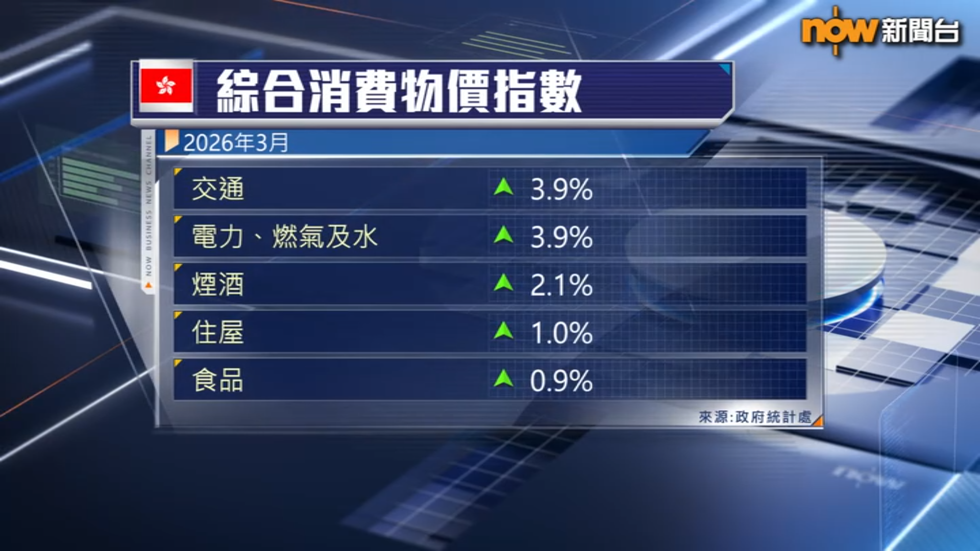 政府統計處公布,3月綜合消費物價指數按年升1.7%,按月持平,但高於今年1、2月平均1.5%升幅;剔除所有政府一次性紓困措施的影響,基本通脹率為1.6%,同樣較1至2月合計的平均升幅為高。