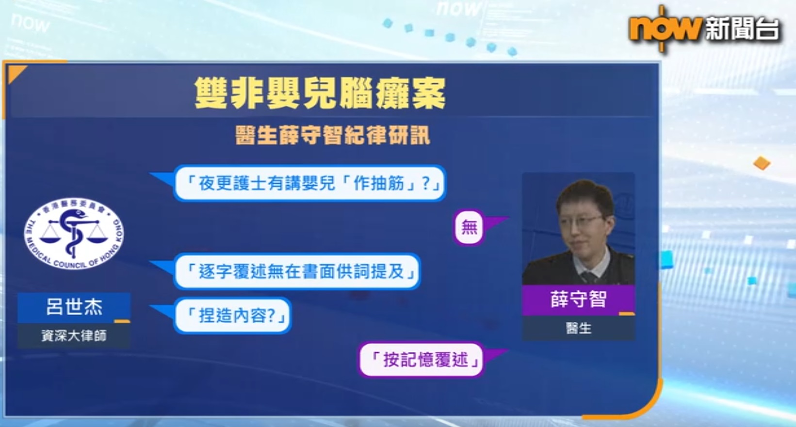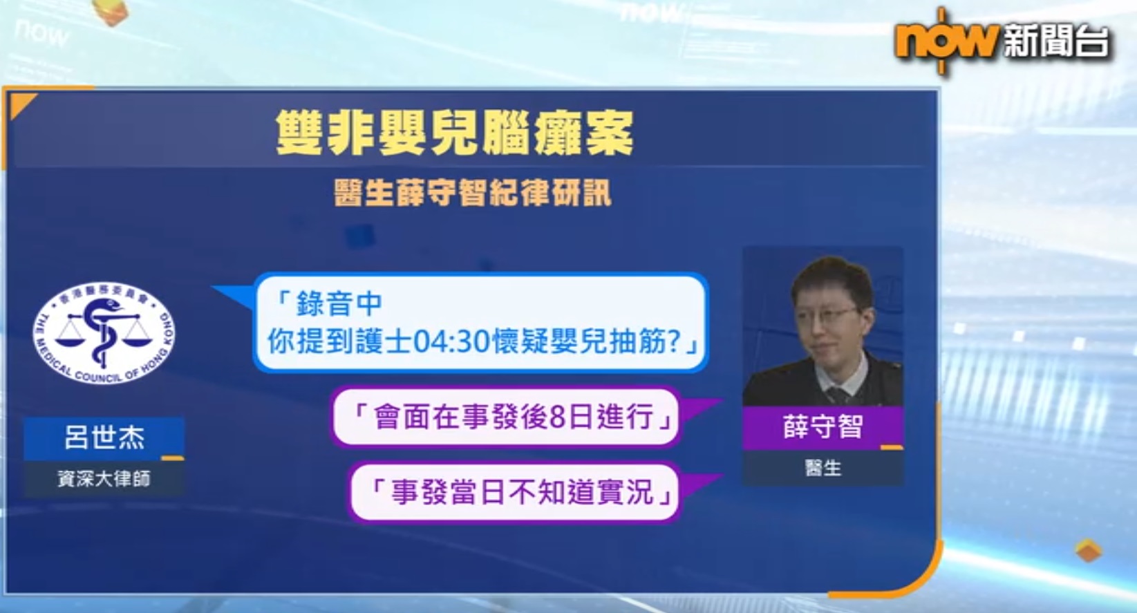 【Now新聞台】雙非嬰兒腦癱案,涉事醫生薛守智再到醫委會接受紀律研訊。薛守智確認夜更護士曾報告嬰兒凌晨有些「濁奶」,他當時判斷並非抽搐。醫委會代表大律師質疑薛守智捏造。醫委會決定押後到6月7日,讓雙方最後陳詞。