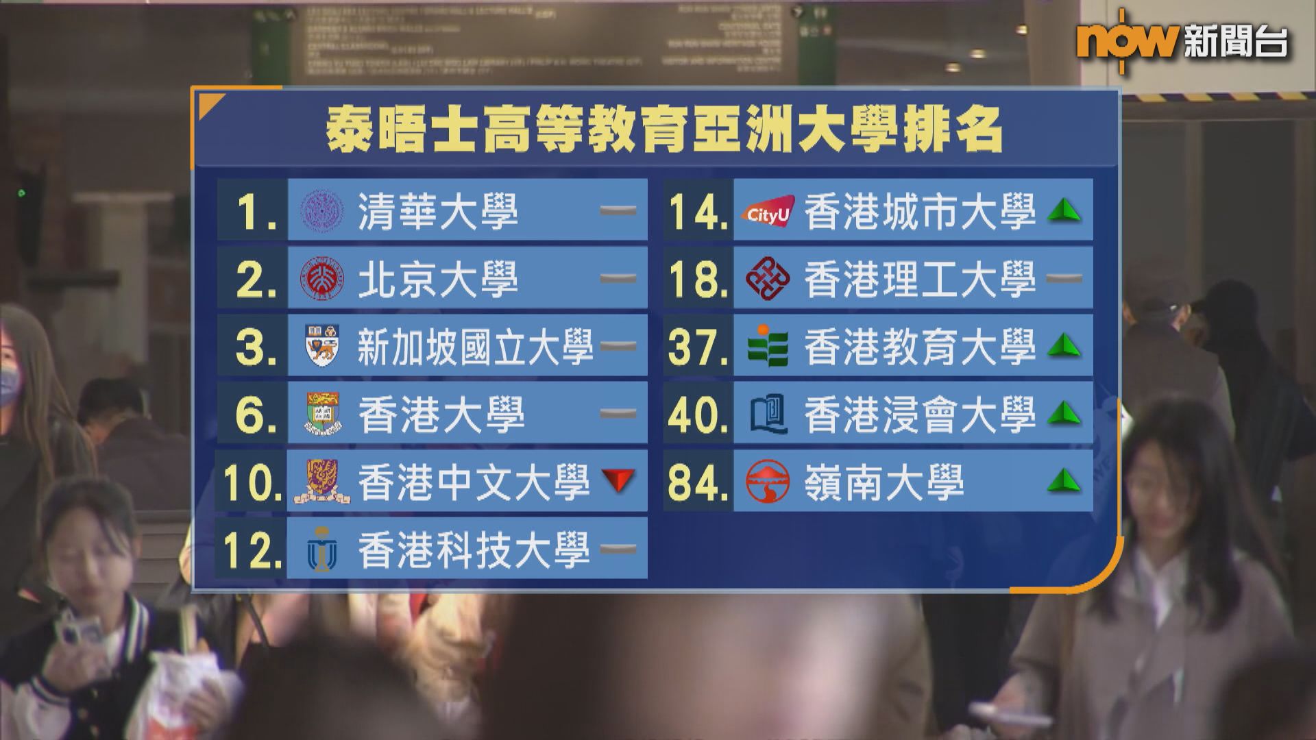 【Now新聞台】香港八間資助大學首次全部位列於英國泰晤士高等教育亞洲大學一百強,當中教育大學和嶺南大學首次上榜。管理層稱,期望政府提供更多資源,協助學校發展科研和吸納人才。