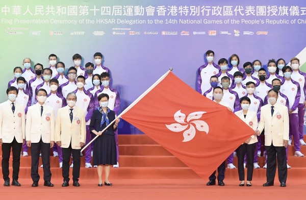 【Now Sports】4年1度的全國運動會將於下月15日在陝西揭幕,特區政府今日在荃灣體育館舉行授旗儀式,行政長官林鄭月娥向民政事務局長兼香港代表團長徐英偉授予區旗。