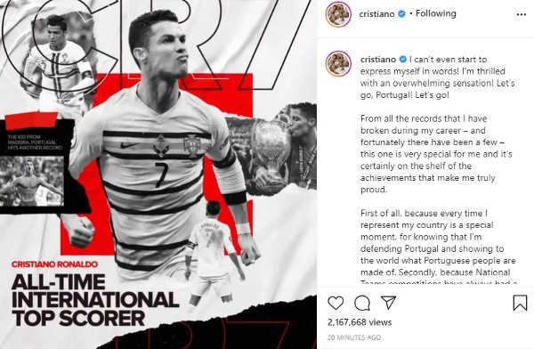 剛回歸曼聯的基斯坦奴朗拿度(Cristiano Ronaldo),於周三世盃外對愛爾蘭梅開二度,憑以一己之力率葡萄牙反勝2:1之餘,以111球成為國際賽歷來最多入球的男子球員,他賽後在社交網絡發放國際賽入球片段,以及一段長文,流露破紀錄的心情。