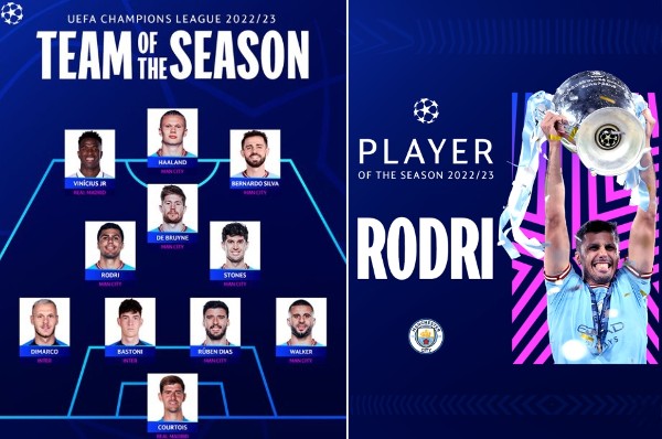 最佳陣容由歐洲足協技術委員會代表評選,曼城入選球員包括終以12球成為賽事神射手的賀蘭,在決賽取得奠勝入球的洛迪靴蘭迪斯(Rodri)、在決賽上半場傷出,但在整個賽事都有佳作的迪布尼,還有賓拿度施華、魯賓迪亞斯、基爾獲加及轉型出任中場的史東斯。
