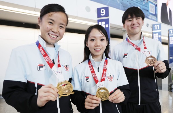 曾綺婷(左起)、劉慕裳、鄭栩彬凱旋。 (@Now Sports)