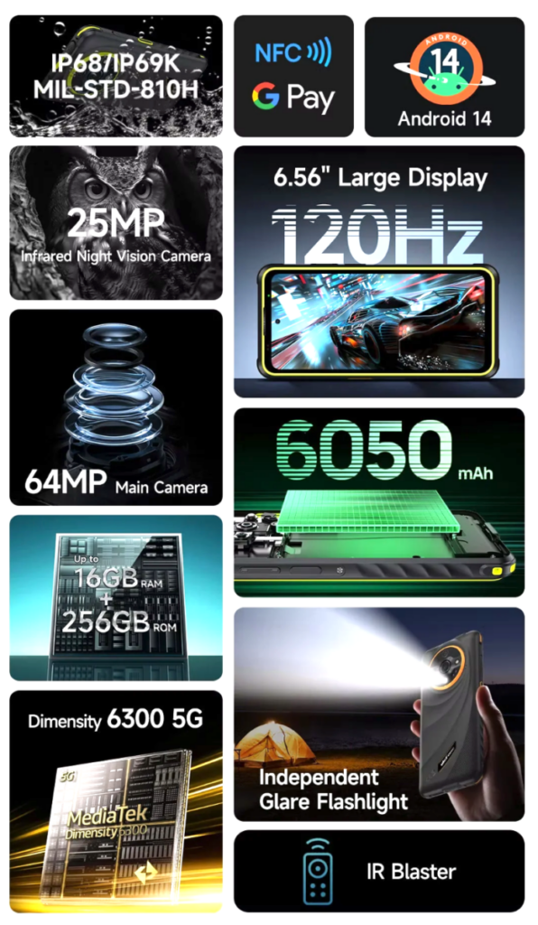 Armor X31 Pro 機身通過IP68/69K/MI-STD-810G等認證。該機採用6.56吋120Hz 屏幕(1600 x 720),配備MTK 攻璣 6300 5G處理器,內建 8GB RAM + 256GB ROM,搭載6400萬像主鏡頭 + 2500萬像夜視鏡 + 200萬像微距鏡及1600萬像自拍鏡頭,電池容量達6050mAh,運行Android 14系統等。