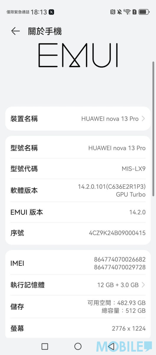 港版 nova 13 Pro採用 EMUI 14.2 系統,512GB 機型約佔用 19.11GB 空間;媒體方面螢幕選項則可獨立設定色彩模式、畫面解析度及螢幕更新率。