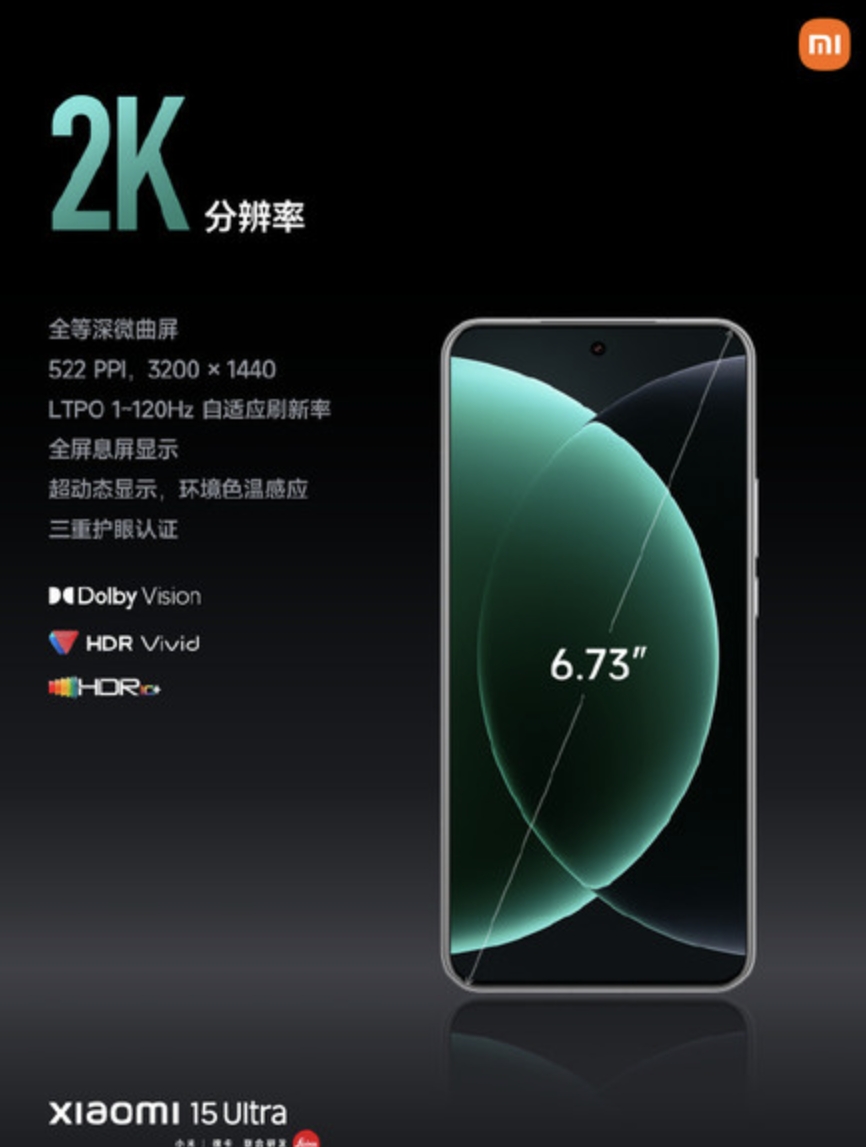 Xiaomi 15 Ultra 屏幕採用了6.73吋2K全等深四曲屏(3200 × 1440)。屏幕支持1-120Hz的LTPO可變刷新率,峰值亮度可達3200nit,並搭載了龍晶玻璃2.0。此外,屏幕還支持專業原色顯示和跨屏同色功能,確保色彩的真實性和一致性。