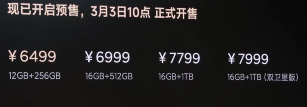 Xiaomi 15 Ultra 國行版分別提供四個版本,分別是12GB RAM + 256GB ROM、16GB RAM + 512GB ROM、16GB RAM + 1TB ROM 及 16GB RAM + 1TB ROM的衛星版),售價分別為6,499、6,999、7,799及7,999人民幣,於即日起預售,3月3日正式上市。