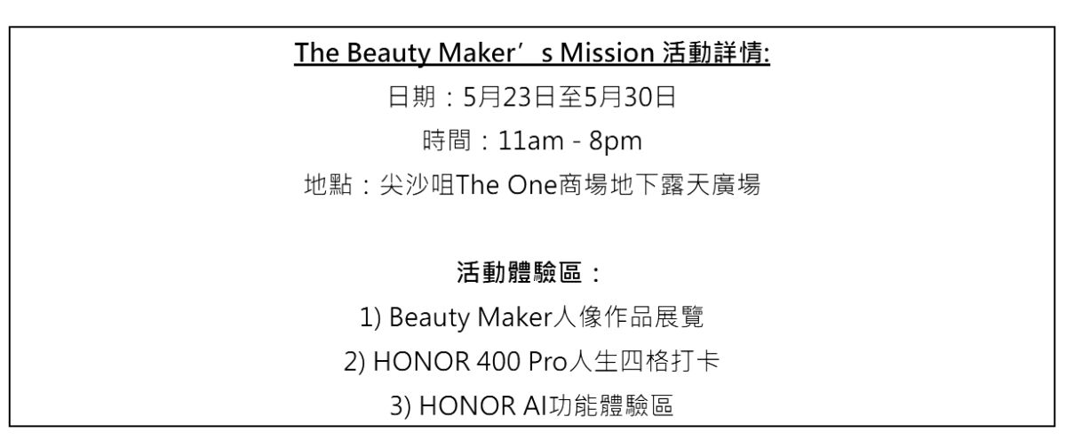 HONOR 400 系列的驚喜推廣活動一浪接一浪!由5月23日起至5月30日,HONOR將會在尖沙咀The One商場地下露天廣場舉行線下推廣活動 「The Beauty Maker’s Mission」,參加者可於活動中體驗各項HONOR 400系列的AI魔法修圖功能,更可以HONOR 400 Pro拍攝人生四格自拍照,與親朋一起留住動人回憶!活動期間,參加者只需在以下體驗區完成各項任務,即可獲贈禮物一份,機會難逢,萬勿錯過!