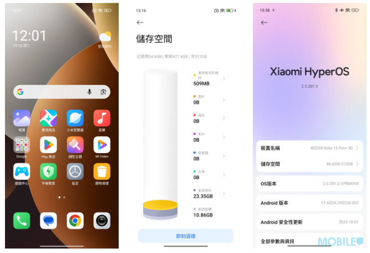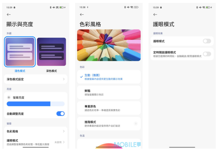 Redmi Note 15 Pro+ 預載 Android 15,啟動後手機約佔用 34.6GB 空間,顯示選項部份具備原生深色模式、可排程定時啟動護眼模式。