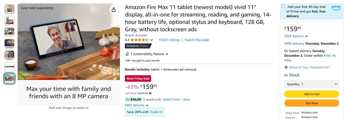 今次大幅減價的平板電腦,是 Amazon 自家品牌推出的 Fire Max 11,128GB 原價為 279.99 美元,即港幣約 $2179,現時最新賣價為 159.99 美元,折合港幣約 $1245,跌至歷史新低價。不過提提大家,購買這部平板電腦不能直送香港,所以需要找坊間的集運公司,例如 Buy and Ship 進行集運。