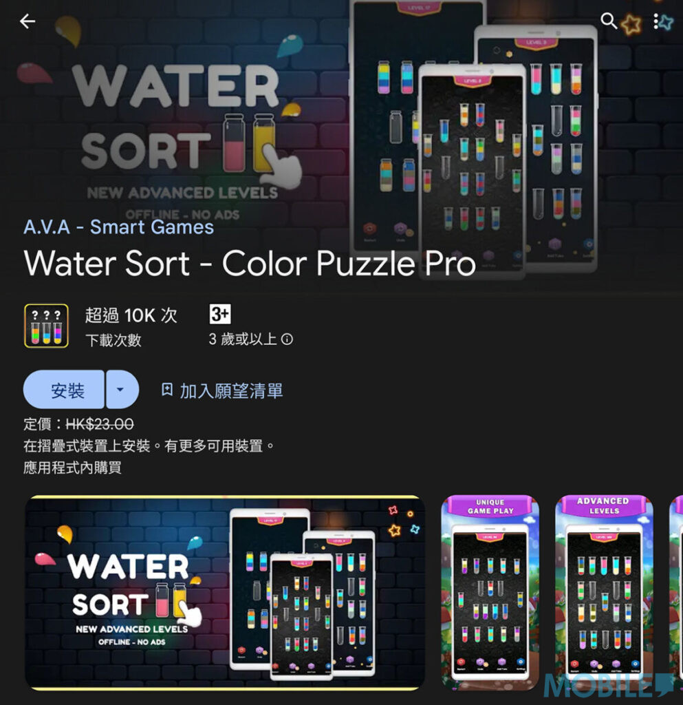 本文刊登時,由 A.V.A Smart Games 製作的《Water Sort – Color Puzzle Pro》,現正於港區 Google Play Store 提供限時免費下載(原價 HK$23)。