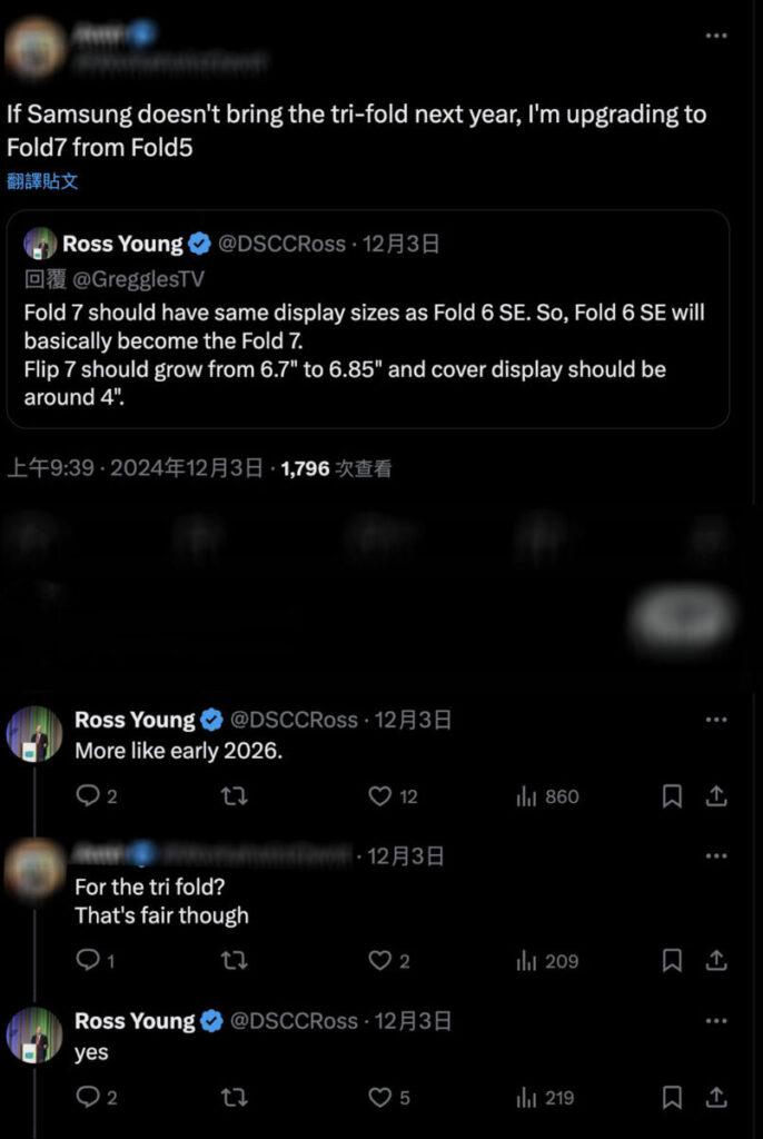 Samsung Tri-fold 資訊由 DSCC 主席 Ross Young,透過在 X 帳號(@DSCCRoss)回應網友關於品牌三摺時間表提問,指廠方或最快 2026 年初推出相關新品。