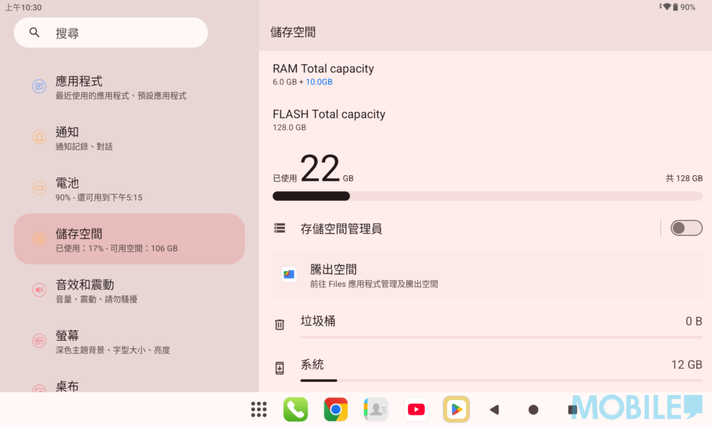 ▲Teclast T60 預載 Android 14 平板電腦系統,而系統只佔22GB 用戶仍有約106GB 供用家使用。