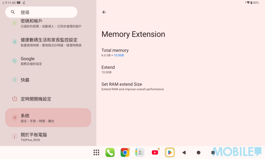 ▲系統內建設有 6GB RAM + 10GB RAM 擴展記憶功能。