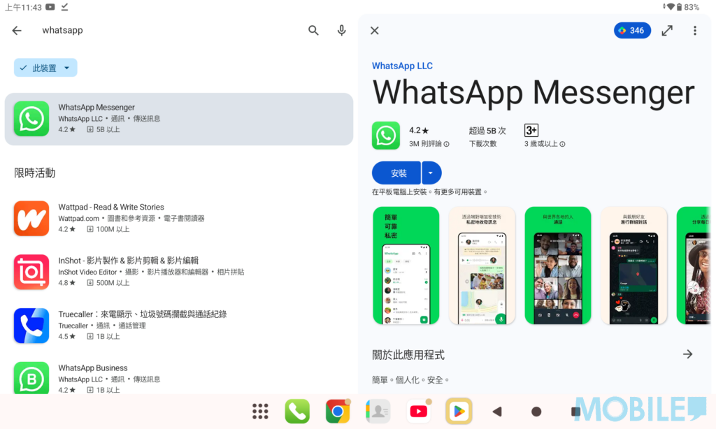 ▲而且於 Play 商店上,更可以直接安裝 WhatsApp 於平板上使用。