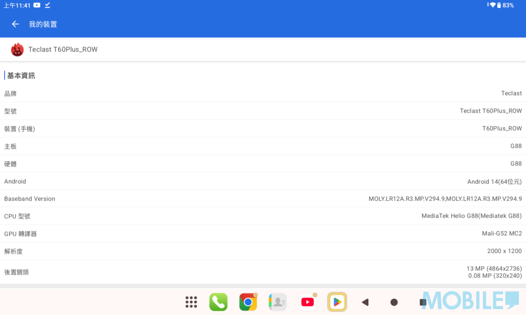 ▲至於規格方面,Teclast T60 Plus 配備MTK G88八核處理器,內建6GB RAM + 128GB ROM,電池容量為8000mAh。