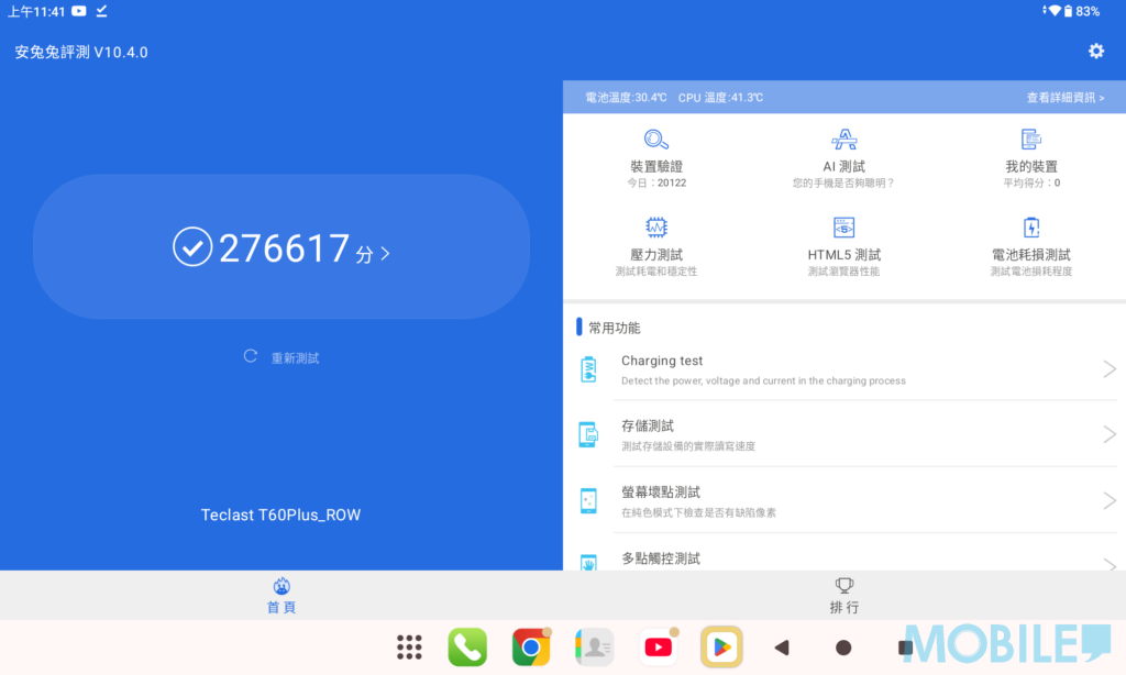▲ MTK G88八核處理器的 Teclast T60 Plus ,於 AnTuTu 仍有276,617分。