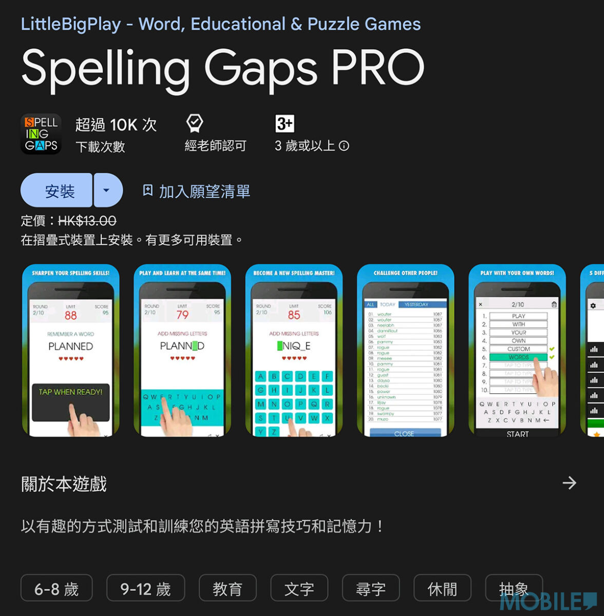 其中《Spelling Gaps PRO》具備 5 級難度英語聽寫及單詞辨識挑哦,提供限時及非限時遊玩方式,同時能學習生字及訓練打字速度。