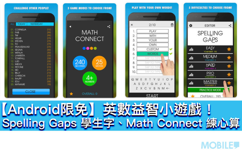 【MOBILE】老少咸宜寓教於樂的益智手機 Game 向來受用家歡迎,近日 Android 平台又有以串字方式學習英文生字的《Spelling Gaps PRO》、跟用串連拼圖鍛練心算的《Math Connect PRO》,提供限時免費下載優惠。