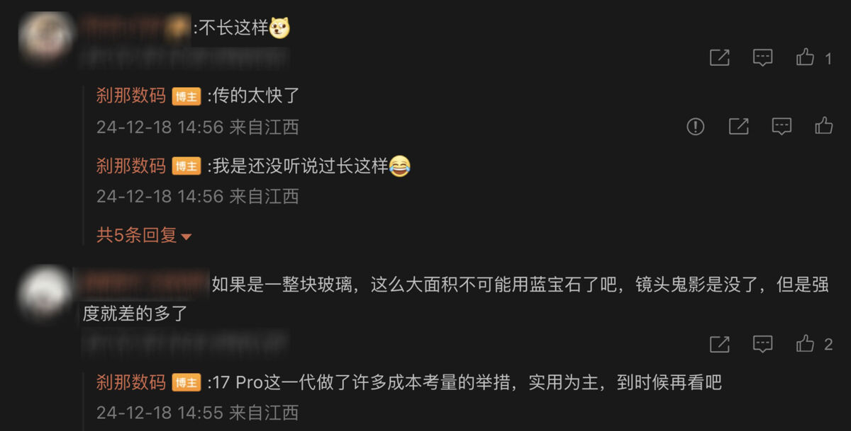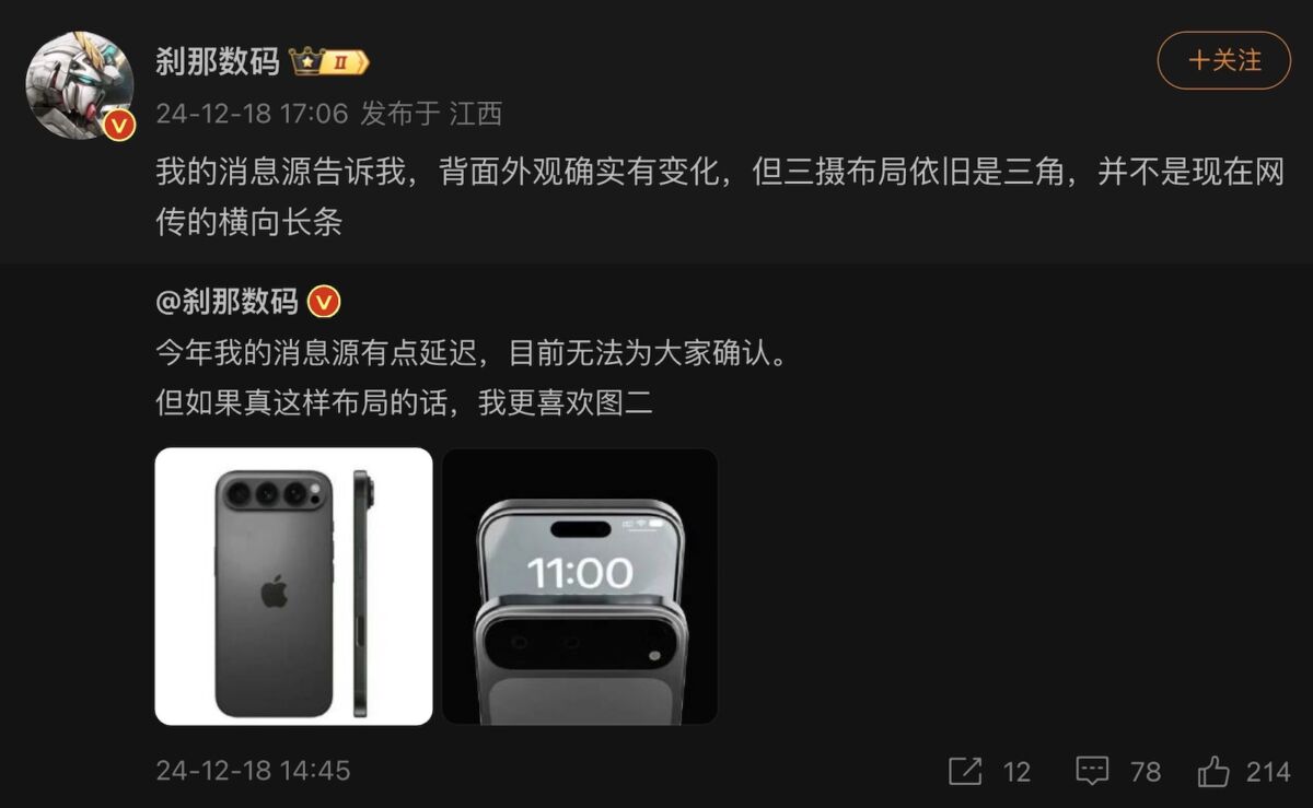 爆料人回應網友提問時,指消息源有達 90% 可靠性,考慮到其良好往績,基本能預期 iPhone 17 Pro 系列外觀風格,應大致維持方形三角鏡頭佈置。