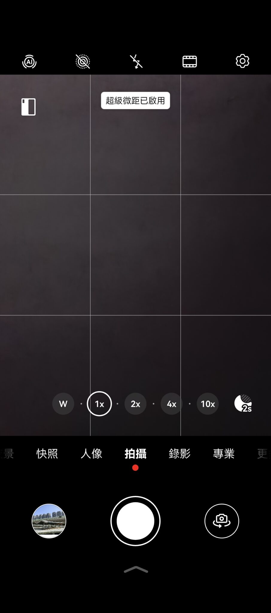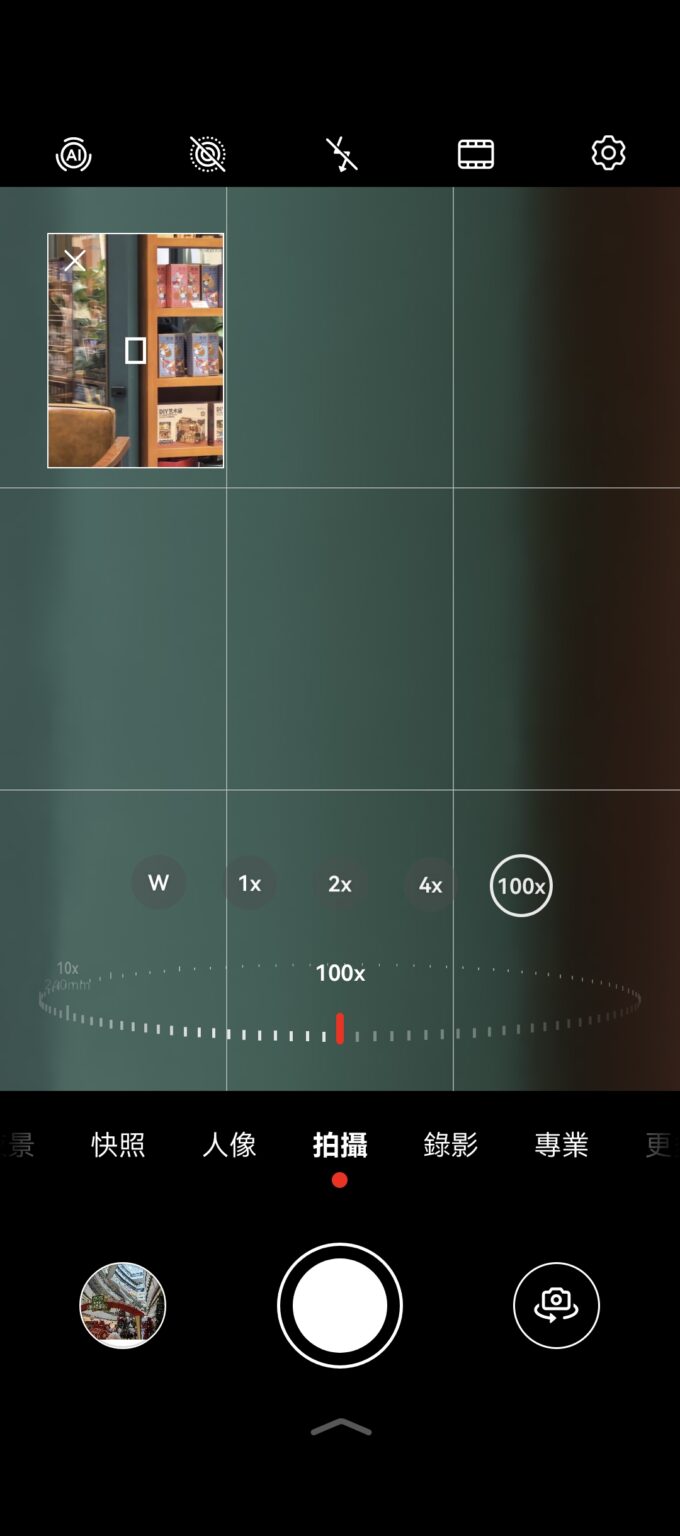HUAWEI Mate X6 相機介面佈置大致跟前代相近,主要功能像「大光圈」跟「超級微距」等拍攝模式,均置於「更多」分頁中;其中啟動「超級微距」時,4x 切換鍵會變成微距標誌更易辨識,而在進行高倍至 100x 變焦時,會彈出子畫面方便進行構圖。