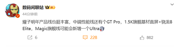 根據博主@數碼閒聊站的爆料,HONOR 明年將豐富產品線,其中中階線將推出 HONOR GT Pro。至於Magic 旗艦系列就有望會新增 Magic7 Ultra,意味著原本的至臻版好有可能會被取消。現時 HONOR Magic7 系列已經推出 Magic7、Magic7 Pro以及 Magic7 RSR,如果再加上 Magic7 Ultra,令整個系列多達四款機款!