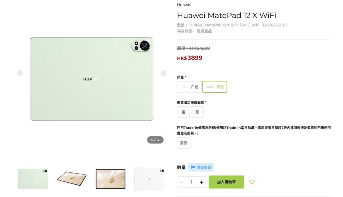 HUAWEI MatePad 12 X 平板優惠,由衛訊香港官方網店提供,優惠價 $3,899(原價 $4,299)機型,為白及綠色款 12+256 配置 Wi-Fi 版本。