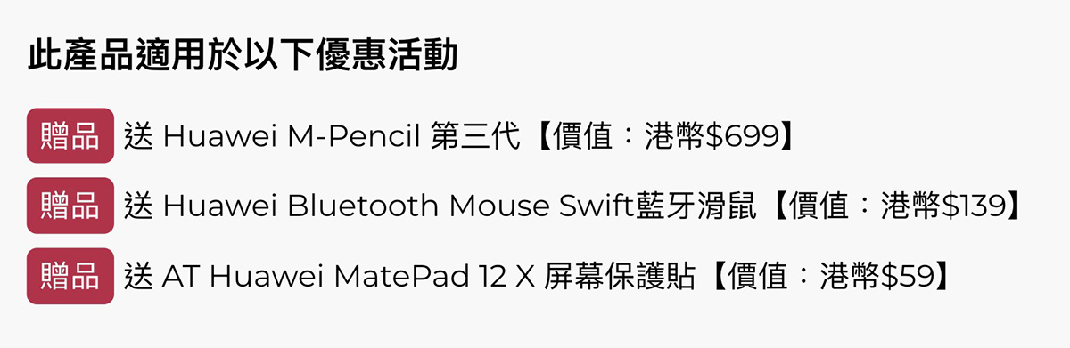 除享有 $400 折扣優惠,成功出機 HUAWEI MatePad 12 X,再送原廠 M-Pencil 第三代、Mouse Swift 藍牙滑鼠跟 AT 屏幕保護貼,總值達 $897。