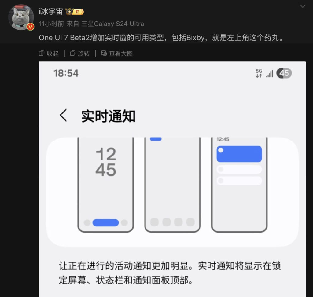 而從國內爆料達人 Ice Universe,在其微博帳號展示 One UI 7 Beta 2 截圖來看,該功能似乎能將實時通知在螢幕底端、左上角及通知列頂部顯示。
