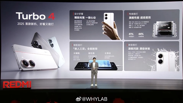 此外,REDMI Turbo 4 是全球首款配備天璣 8400-Ultra 的手機,該處理器採用台積電 4nm 制程,CPU由 1 × 3.25GHz Cortex-A725 + 3 × 3.0GHz Cortex-A725 + 4 × 2.1GHz Cortex-A725組成,GPU 是 Immortalis-G720 MC7 1300MHz。