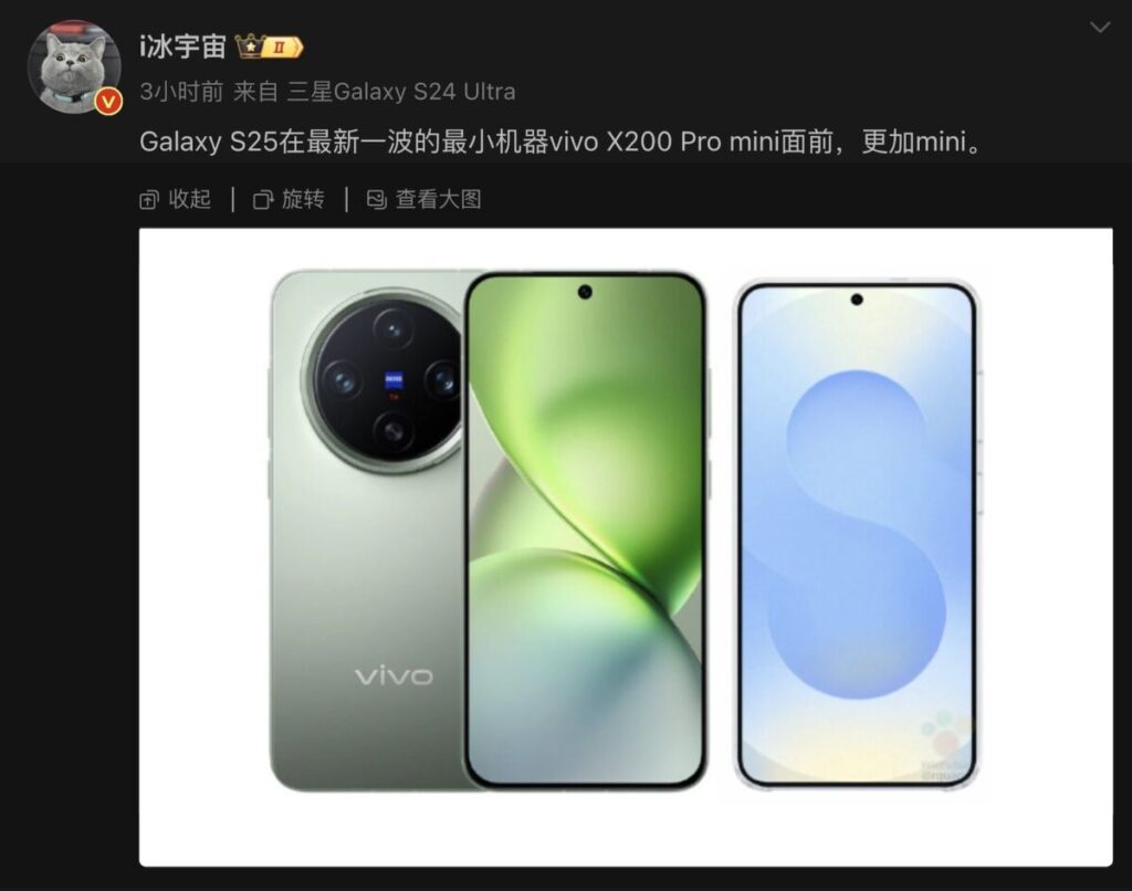 爆料人又將 Galaxy S25 與早前以小巧機身為賣點的 vivo X200 Pro mini 比較,指前者擁有更小巧機身。作為參考 X200 Pro mini 寬度 71.76mm、機重 187g。