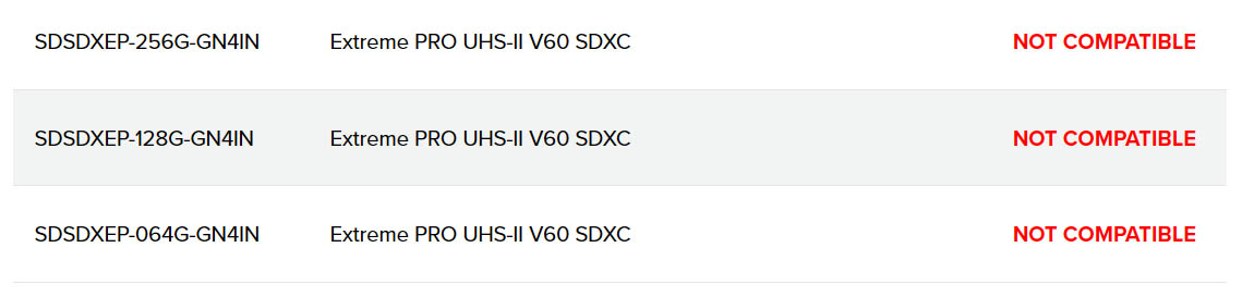Canon 早前已發出警告,指出部分SanDisk Extreme PRO SDXC UHS-II 64GB、128GB 和 256GB V60 記憶卡,不兼容EOS R5 II。Sandisk亦確認事件,在官網為用戶提供支援資訊,受影響的記憶卡都屬於較高階的Extreme PRO UHS-II V60 SDXC,具體型號因地區而異。但須留意,不是全系列的記憶於都有問題,只是最低容量的三款,64GB、128GB 和 256GB出問題,其餘512GB和1TB則無兼容問題。