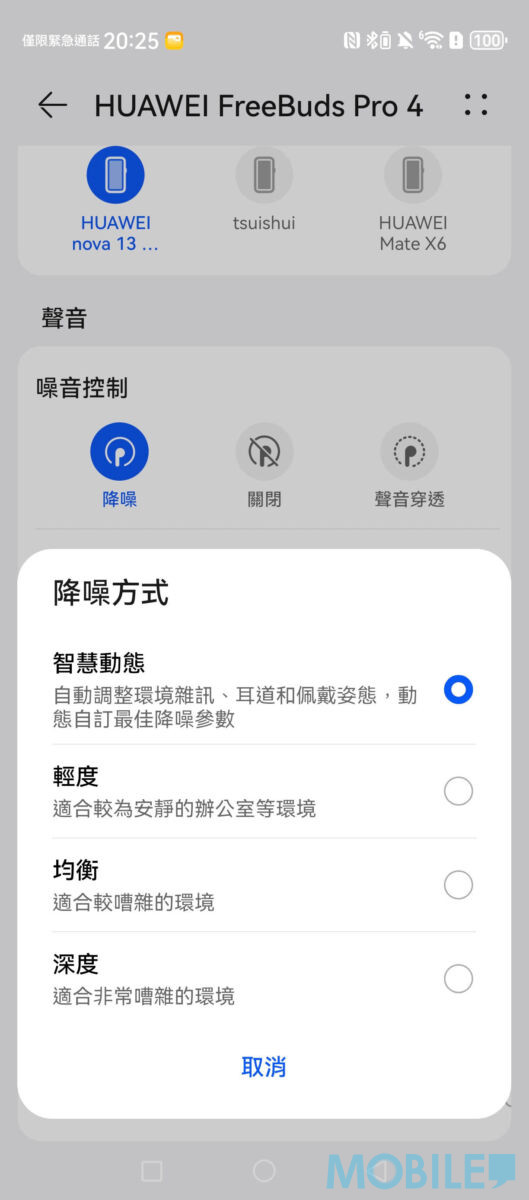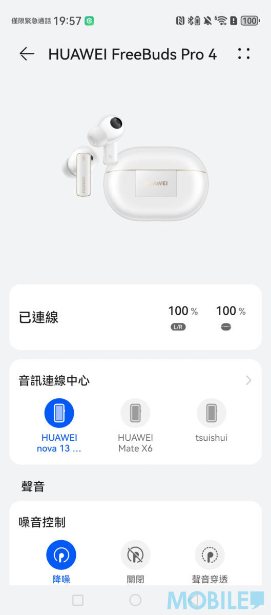以支援 L2HC 編碼的 nova 13 Pro 連接 FreeBuds Pro 4,打開裝置即能快速配對,「智慧生活」提供全面降噪、播放模式及空間音訊設定,操作簡便。