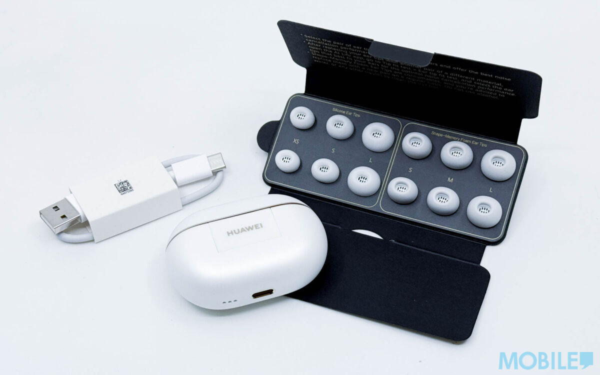 開箱港版雪域白色款 FreeBuds Pro 4 耳機,大盒包裝附設 Type A 轉 C 充電級、跟額外大中小尺寸矽膠及記憶海綿耳塞各一組,滿足不同用家需求。