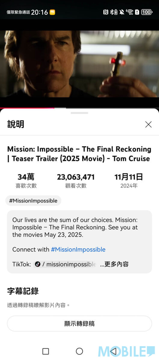 影片播放方面,Freebuds Pro 4 播放《職業特工隊8》預告片,配合空間音訊提供出眾環迴音訊表現。