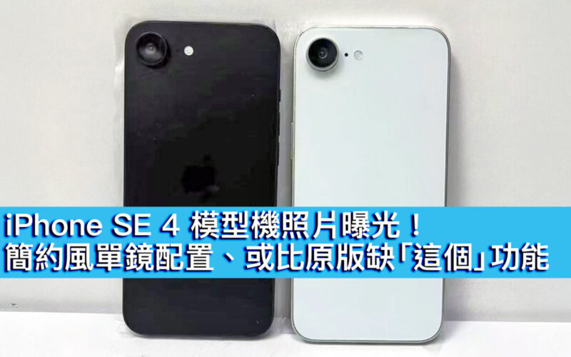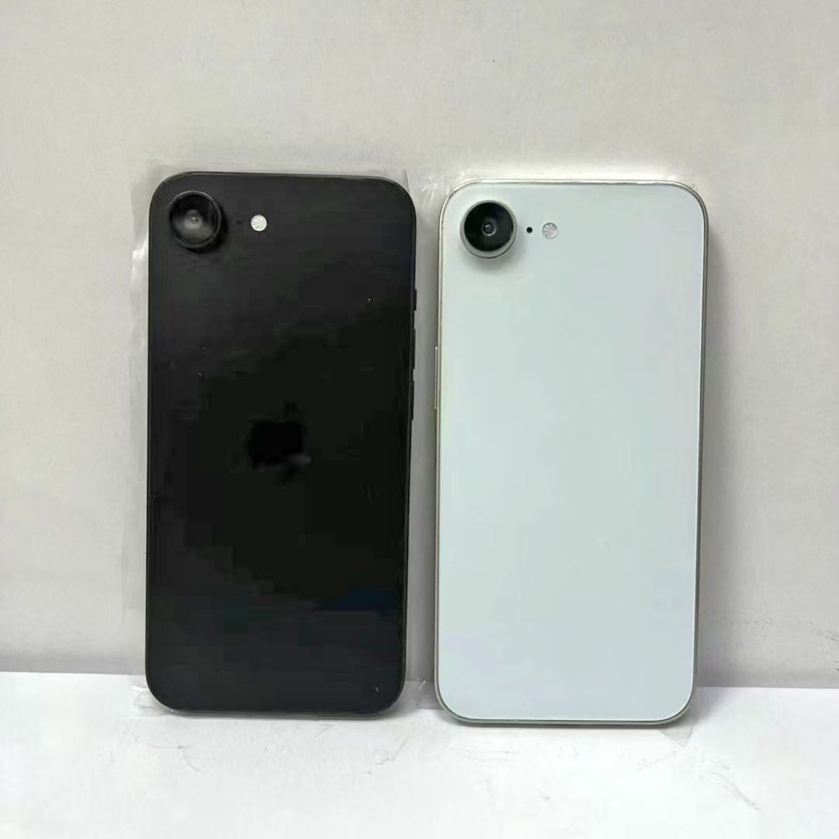 流出疑似 iPhone SE 4 照片,展示了黑及白色(或為淺綠色)機模,後背部份可看到裝置一如傳言所說,採用簡約風單鏡設計,照片似乎隱去了蘋果標誌。