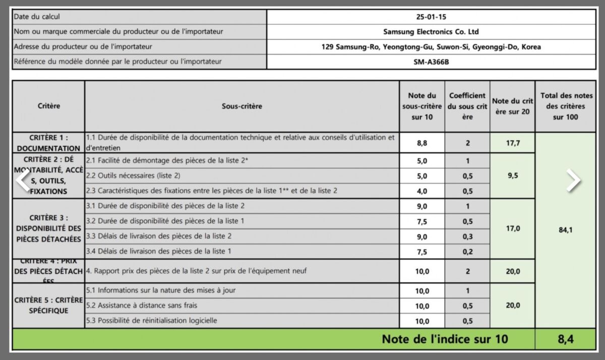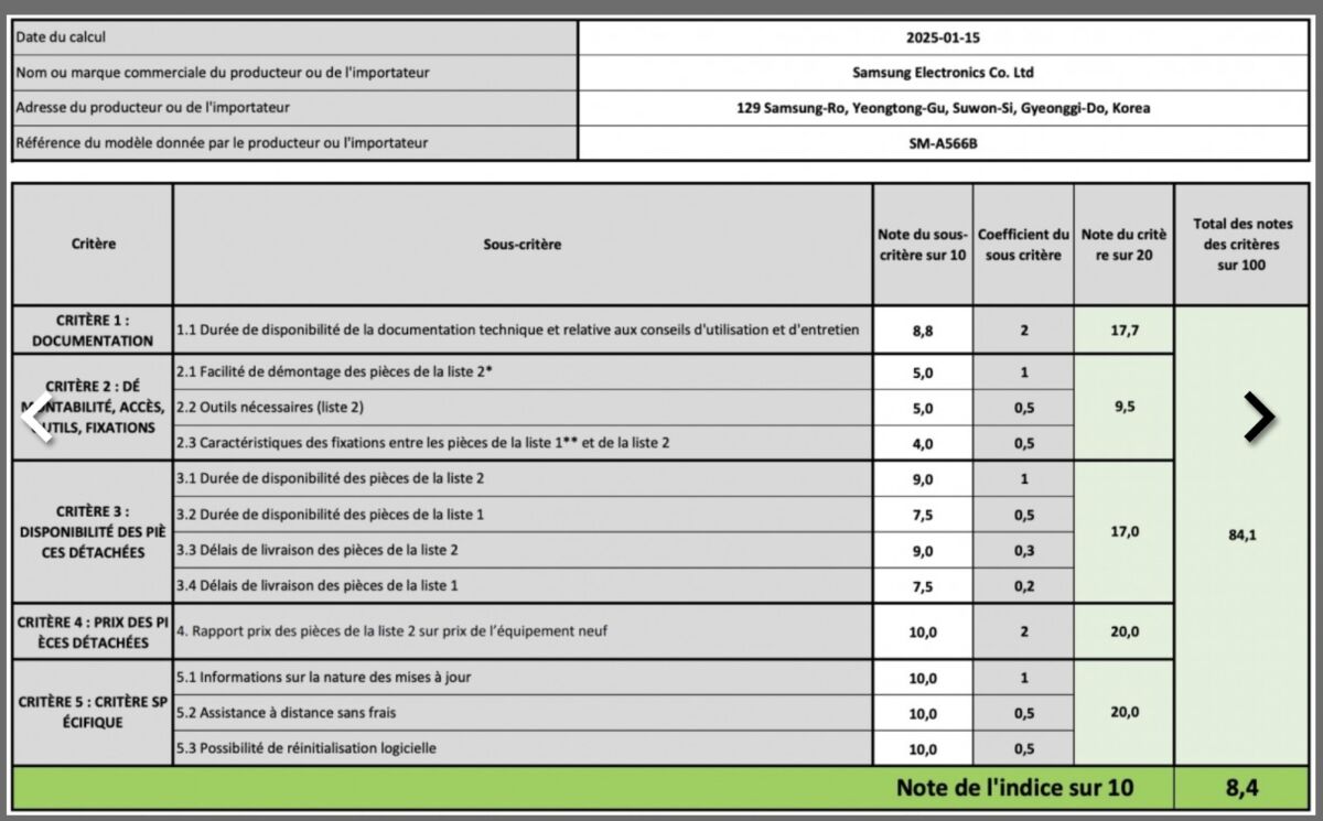 法國政府自2021年起強制要求電子產品標示維修評分,該指數涵蓋零件供應、拆解難易度等10項評估標準,並推動電子產品永續發展。而SAMSUNG 法國官網意外洩露了尚未發表的 Galaxy A36 及 Galaxy A56 維修評分指數。