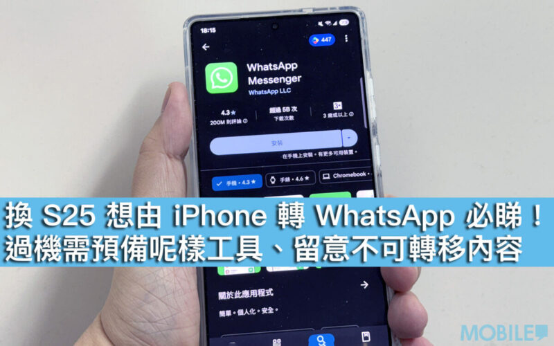 而 S25 系列等三星手機用家,就需要預備最新版 Samsung Smart Switch 及 WhatsApp 程式,新舊裝置相同手機號碼,及必需以 USB-C 連接線進行轉移。