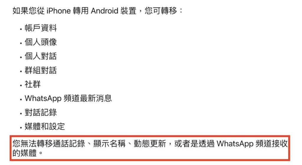 根據 WhatsApp 發表「如何將對話從 iPhone 移至 Android 裝置」文章內容顯示,現時過機可繼承個人對話、群組對話,但對話記錄、動態更新及接收媒體除外。