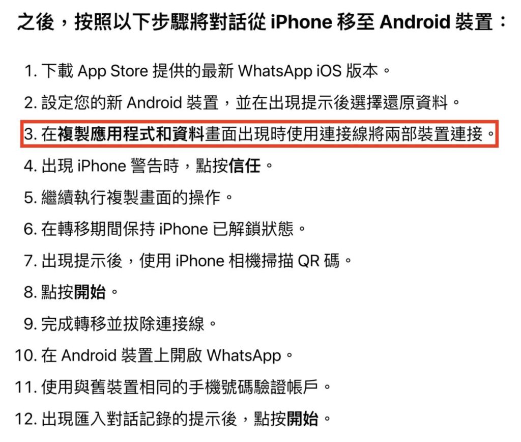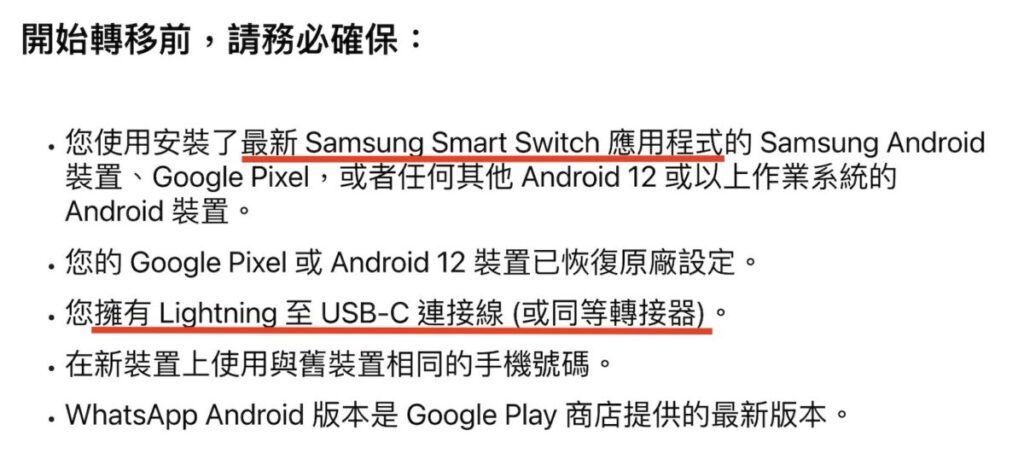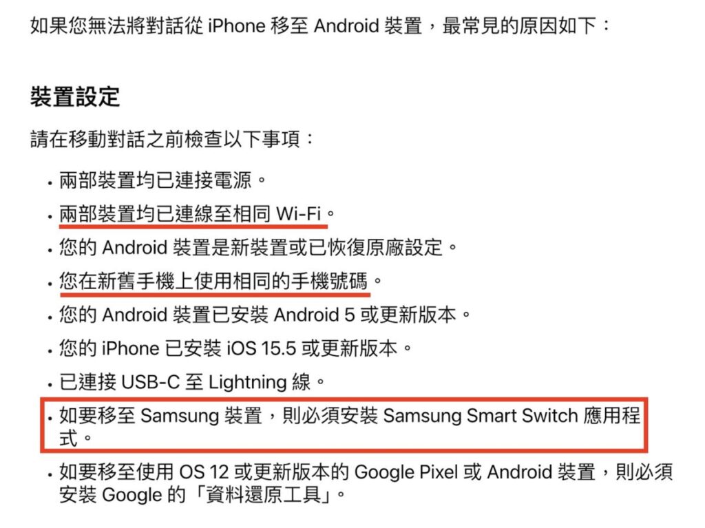 而據「無法將對話從 iPhone 移至 Android 裝置」官方文章內容,轉移失敗或包括不同 Wi-Fi 連接、三星手機沒使用 Smart Switch、轉機前已啟動 WhatsApp 等。
