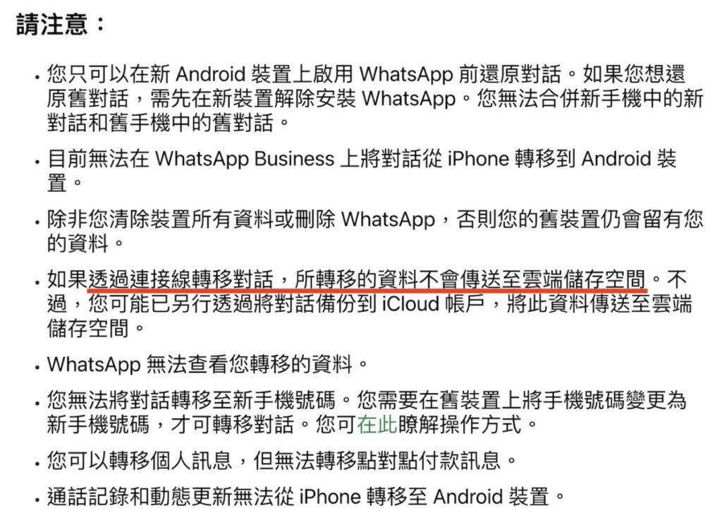 另外需要留意的是,使用連接線轉移 WhatsApp 的話,除非事先另外備份至 iCloud 帳號,不然數據內容將不會傳送至雲端空間。