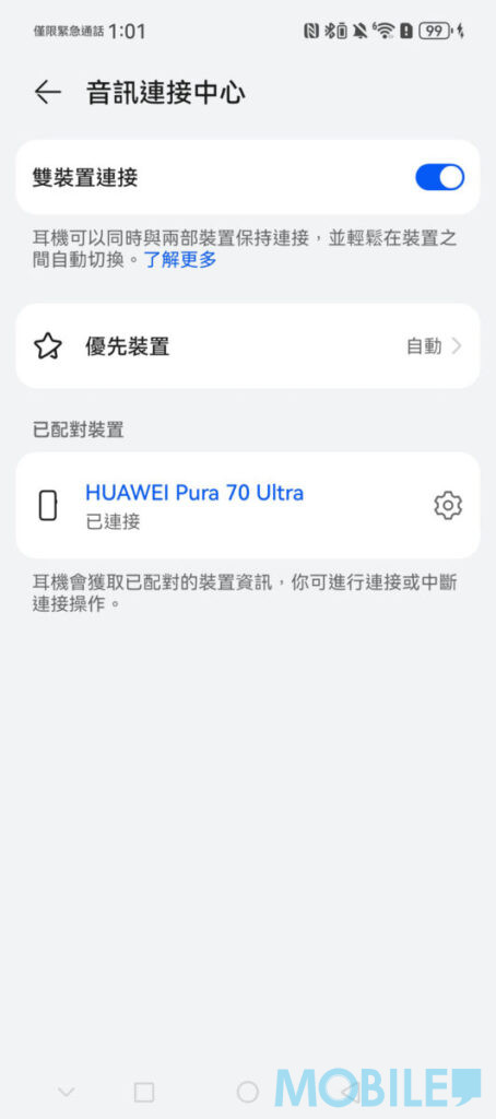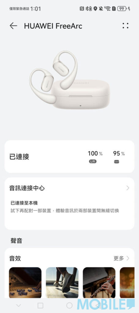 這次以 HUAWEI Pura 70 Ultra 連接 FreeArc,安裝並啟動《智慧生活》可快速連接耳機;系統預載了多組播放模式同時,亦具實用功能如雙裝置連按、遊戲低延遲等。