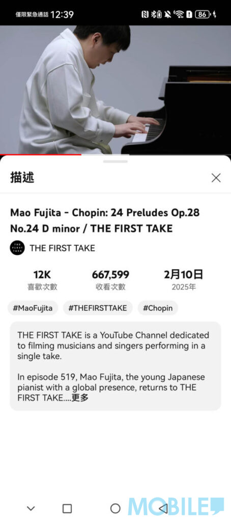 細節重現部分,播放藤田真央《蕭邦前奏曲Op.28, No 24》First Take 影片,彈奏部分充分還原;人聲部分,播放周深《煙花易冷》高音清澈嘹亮。