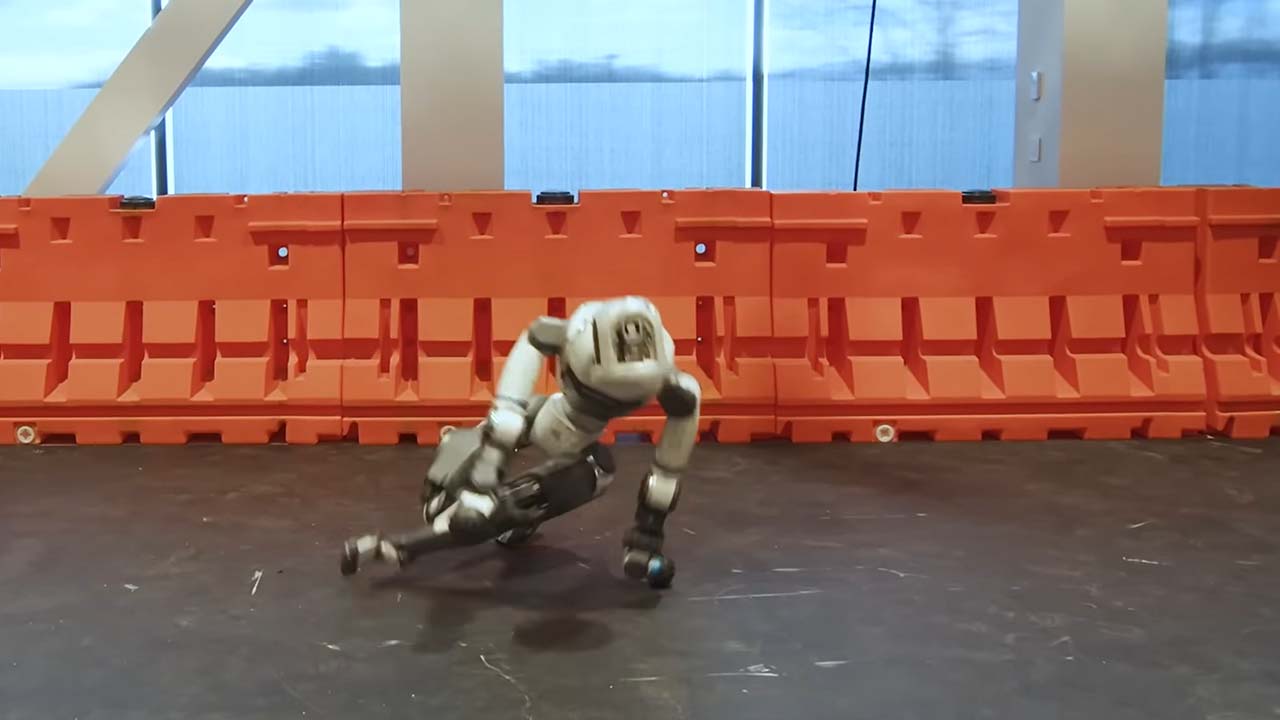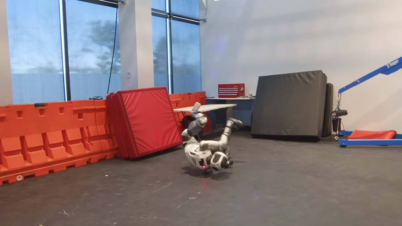 好戲在後頭,Atlas突然由站立姿勢往後退,然後來一個真得有點假,假得又好真地摔倒地上,Altas接著更做出激似「風車」的翻滾動作,俐落地滾了一圈後起身。Atlas隨後又有一段倒立前手翻,動作極為流暢。