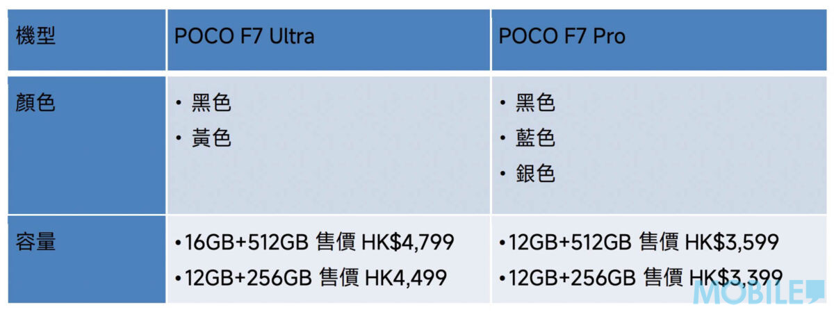 至於配備 8G3 的 POCO F7 Pro 則具黑藍銀三色款,售價 $3,399(12+256)及 $3,599(12+512),次旗艦效能中階機售價,效能價格比一時無兩。