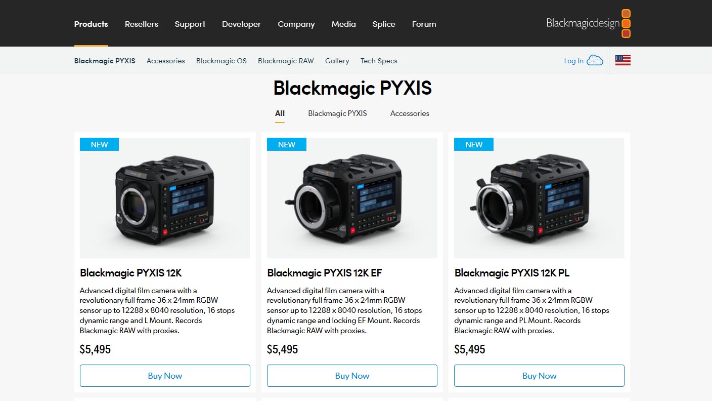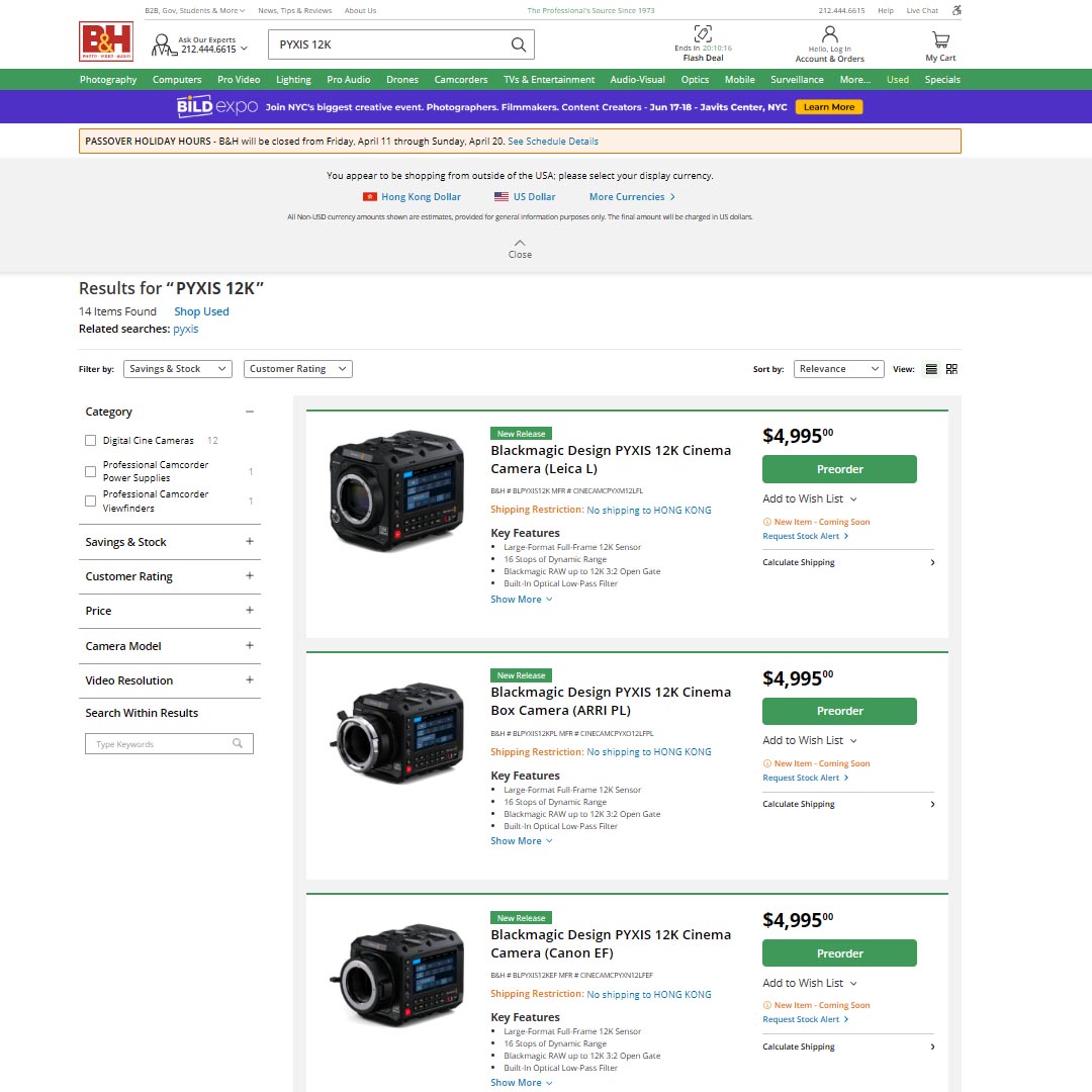 美國攝影器材大型零售商 B&H 的網站,截至目前 (香港時間4月7日14:50) 仍未更新 PYXIS 12K 及其他產品價格,預料於短內跟隨調整。