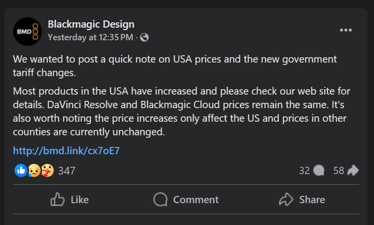 Blackmagic Design 於官方 Facebook 發聲明指出,「我們想就美國價格與政府關稅變化發表簡短說明。美國市場多項產品價格均有所上調,詳細資訊請參閱我們的官方網站。DaVinci Resolve 與 Blackmagic Cloud 的價格維持不變。這次價格調整僅限於美國,其他國家地區目前仍維持原價。」