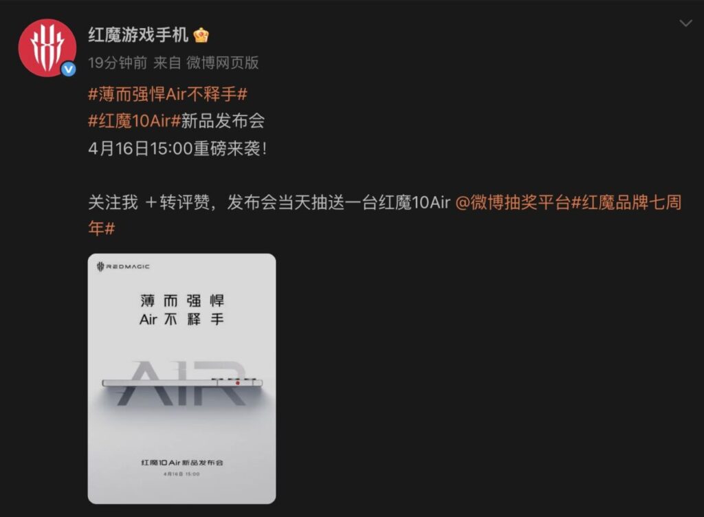 這次 Air 輕薄機將由電競品牌 RedMagic 推出,據官方公佈資訊將為紅魔 10 系列遊戲手機新品,產品將名為 Redmagic 10 Air 並在 4/16 現身。