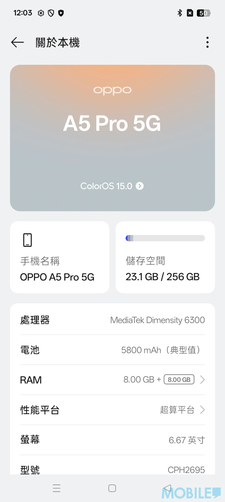 ▲至於系統方面,OPPO A5 Pro 預裝 Android 15 + Color OS V15 UI,256GB ROM 版扣除原裝系統後,仍有232.9GB 空間供用戶使用。